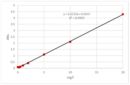 The calibration curve (Figure 2) was made by taking the absorbance measurement of standards prepared in SBF and establishing the relation with the solution concentrations and absorbance at the length of 216.0 nm, with R2 = 0.9993. The lower limit of the calibration curve was 0.25 mg/L, whereas the higher limit was 20.0 mg/L.
