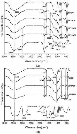 To better understand the chemical influence of the inorganic and organic components of the synthesized hybrid materials, in Figure 4A, the spectra of the silica and the caffeic acid are compared to the SP12Ay systems, whereas in Figure 4B, the spectra of the silica and polyethylene glycol are compared to SPxA20 systems. SiO2 showed the -OH stretching and bending at 3450 cm−1 and 1640 cm−1. The shoulder at 3700–3500 cm−1 could be ascribable to the -OH of the silanol groups [44,45,46]. The Si-O-Si asymmetric stretching is assigned to the band at 1077 cm−1 with the shoulder at 1200 cm−1 [44,47,48]), whereas the peak absorption at 800 and 460 cm−1 are attributed to Si-O-Si and Si-OH bending vibrations [45]. In addition, the band at 1385 cm−1 is assigned to residual HNO3 [42]. In all the spectra shown in Figure 4A, at a fixed amount of silica and polyethylene glycol (12 wt%), the increment in the caffeic acid amount corresponds to an increase in the intensity of the band detected at 1745 cm−1 (C=O vibration [36]). This is further proof that caffeic acid is present in its oxidized form in all the synthesized systems. Figure 4B pointed out that at a fixed amount of silica and A (20 wt%), an increase in polyethylene glycol corresponds to an increase in the C-H twisting and C-O-C ether stretching [40,49] detected at 1240 and 1100 cm−1, which also affect the shape of the shoulder at 1200 cm−1 in all the spectra. Moreover, the signals detected at 2900–2800 cm−1, assigned the C-H vibrations, increase with the increasing of P content. Additionally, all the bands under the wavenumber range 1000–460 cm−1 are almost superimposable to those of pure SiO2 [42]. Finally, The co-presence of P, A, and S absorption peaks suggests the formation of hybrids, in which both the inorganic and organic parts could interact with hydrogen bonds, as also reported in [20].