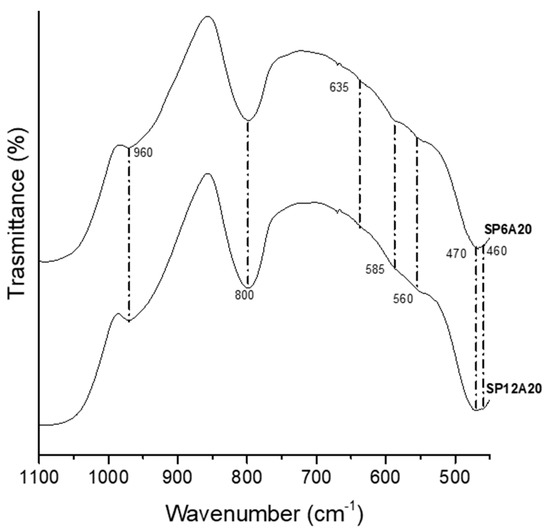The HA forming-ability of the synthesized hybrid materials was performed in vitro using the Kokubo Test [37]. To this aim, the samples were immersed in SBF solution for 21 days and the nucleated HA on the surfaces of the materials was investigated using FT-IR, SEM/EDX, and XRD analysis. Figure 5 reports the obtained FT-IR spectra of SP6A20 and SP12A20 hybrid biomaterials after soaking in SBF. The spectra revealed the presence of new peaks at 635, 585, 560, and 470 cm−1 that are related to P-O bending and vibration modes [42,50,51].