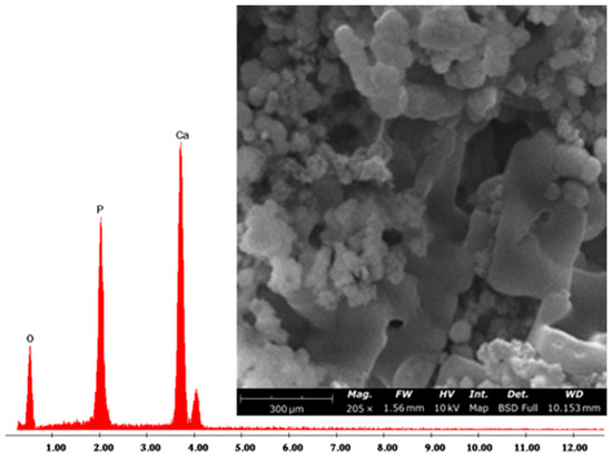 Moreover, the SEM/EDS image (Figure 6) of SP12A20 hybrid biomaterial confirmed the formation of the HA. Indeed, the sample surface was almost covered by globular-shaped HA particles [52] whose elemental composition was composed mainly of Ca and P, with an atomic ratio equal to 1.67. This finding is also in accordance with another similar system in which SP systems were doped with indomethacin [53].