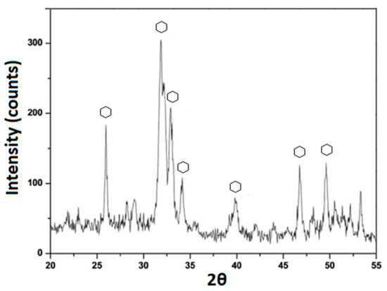 Furthermore, the XRD spectrum, reported in Figure 7, revealed that the spheres nucleated on the hybrid surfaces possess the typical HA crystalline peaks with hkl indices of (002), (211), (300), (202), (310), (002), (222), and (213), obtained by matching the spectrum with one found in ICDD database.