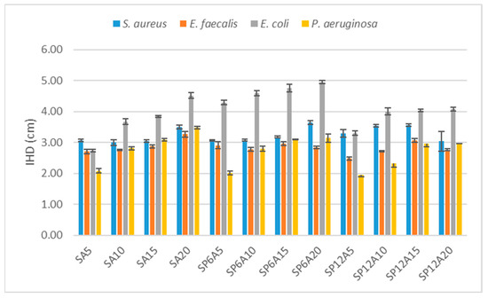 The antimicrobial activity was expressed by measuring the IHDs as reported in paragraph 2.4. Figure 8 describes, as an example, the acquired images of the bacterial growths of S. aureus and P. aeruginosa incubated with SA20, SP6A20, and SP12A20 hybrid biomaterials, while Figure 9 reports all the IHDs obtained for each synthesized system.