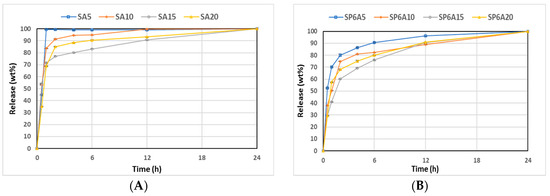Figure 10A–C illustrates the cumulative kinetics as a percentage of the drug released, whilst Figure 10D–F reports the release rates of the drug over experimental time. The rate of each stage might depend on the formation of hydrogen bonds among the carbonyl group of drugs with the -OH group of silica and aqueous solvent (SBF) [65]. SAy samples showed the fastest release (wt%) and rate (mg/min) (Figure 10A,D). In particular, the SA5 hybrid released all the drug within 1 h, while SA10, SA15, and SA20 released up to 90 wt% of the drug within 6 h, and the release was completed after 12 h for the SA10 hybrid and 24 h for SA15 and SA20. An increase in P amount of 6 wt% (Figure 10B,E) led to a slight decrease in the release rate. Indeed, SP6A5 released 90 wt% of the drug in 6 h and released all the amount after 24 h. An increase in caffeic acid amount (from 10 to 20 wt%) corresponds to a decrease in wt% and rate release, which seems to be more controlled. Furthermore, the data reported in Figure 10C,F, related to SP12Ay hybrid systems underline that an increase in polyethylene glycol and caffeic acid amount led to a drug-release rate lower than the samples without the P, which is also confirmed by the graphs shown in Figure 11. According to [66], which investigated the properties of silica matrix synthesized via sol-gel route by using different TEOS:H2O ratios, a silica matrix with TEOS:H2O = 1:2 ratio has a nanometric scale (12.50 nm < x < 32.01 nm), a high surface area (347.31 m2/g < x < 549.92 m2/g), a total pore volume ranging from 0.41 to 0.51 cm3/g, and isotherm hysteresis type H2. These features could explain the reason why there is a faster release of the drug in the matrices without P. Moreover, the presence of P positively affects the release of the drug increasing the control of release over time. Finally, the kinetic study suggests a two-step mechanism: the first fast step occurs by dissolution and diffusion of the caffeic acid entrapped onto the material surface, while the second slow step occurs with the dissolution and diffusion inside the material clusters.