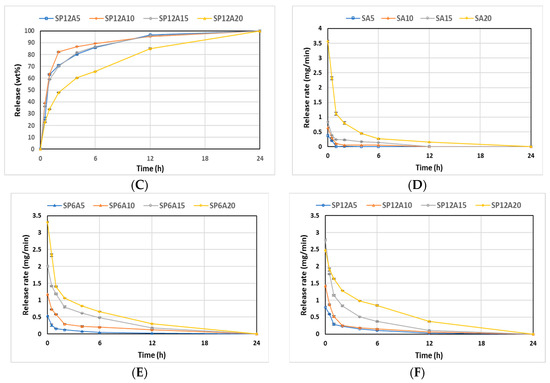 (A) SAy, (B) SP6Ay, and (C) SP12Ay drug-release plots. (D) SAy, (E) SP6Ay, and (F) SP12Ay release rate plots of the hybrid biomaterials.