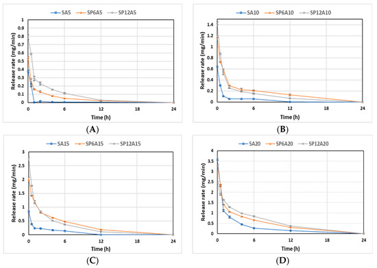 Release rate plot of (A) SPxA5, (B) SPxA10, (C) SPxA15, and (D) SPxA20 hybrid biomaterials.