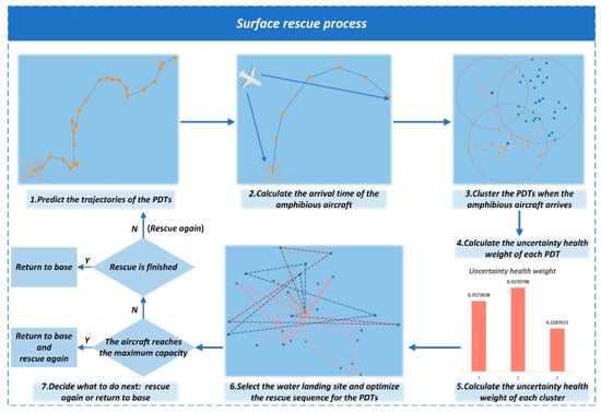 The SRP of amphibious aircrafts for medium/distant maritime rescue is shown in Figure 1. The probable drift trajectories of the PDTs should be predicted first. Next, the time when the amphibious aircraft arrives at the distress position should be calculated. In order to maximize the rescue performance of the amphibious aircraft, the PDTs should be clustered when the amphibious aircraft arrives. Additionally, the uncertainty health weight of individuals in each cluster should be calculated. The criterion of selecting a water landing site is based on the maximum uncertainty health weight in the clusters, and should be the destination of the amphibious aircraft. After the water landing site is selected, the lifeboat on the amphibious aircraft should be sent out to rescue the PDTs in turn. Therefore, it is necessary to optimize the rescue sequence of the PDTs in this cluster to save rescue time. Then, the amphibious aircraft should return to the base after reaching its maximum capacity, otherwise it will change the clusters. Finally, the rescue should be finished when the end condition is satisfied. Otherwise, the rescue should be implemented again by the amphibious aircraft.