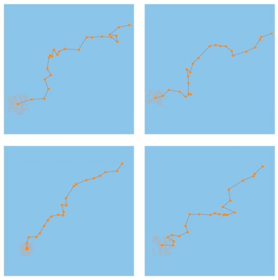 Considering that the ocean wind speed and the ocean flow speed, etc., are uncertain, and that the cannot be infinitely small, Monte Carlo experiments were used in this study which could simulate these uncertainties []. Additionally, in an actual rescue process, the lifeboat would have a certain range of rescue capabilities. Although the predicted location was not the accurate position, the PDTs could be rescued by the lifeboat within a little amount of time after it reached the predicted position of the PDTs. Therefore, the average predicted result of the Monte Carlo experiments was used to find the predicted trajectory of each PDT to improve the successful rescue rate. As shown in Figure 2, four examples of trajectory prediction were given.