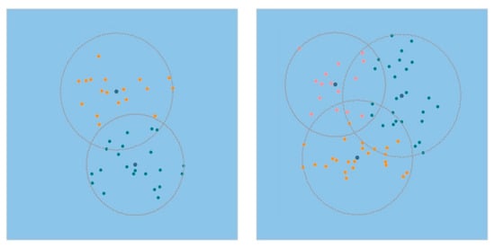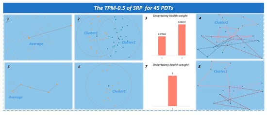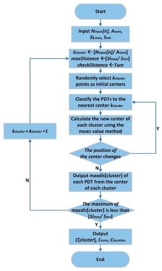 The flowchart of k-means is shown in Figure 3. As seen in Figure 3, the detailed process of k-means* is given. The pseudo code of k-means* is shown in Appendix A. In addition, Figure 4 shows the results of the clustering of the PDTs by k-means*. The number of the PDTs is 40 in Figure 4 (left) and 65 in Figure 4 (right).