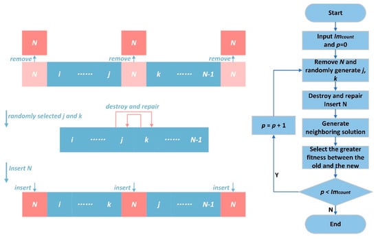 Different from the typical GA [,,], in this study, the GA* could perform self-optimization by using LNS []. With LNS, the iterative optimization converges faster. Moreover, considering the limited rescue capability of the lifeboat, the optimization process of this study was slightly different from that of the typical GA. In detail, the lifeboat should have returned to the amphibious aircraft, which would have caused the rescue sequence to have many repeated points. Therefore, all operators were adjusted for better optimization. Furthermore, the detailed optimization process of the GA* is shown in the following section.