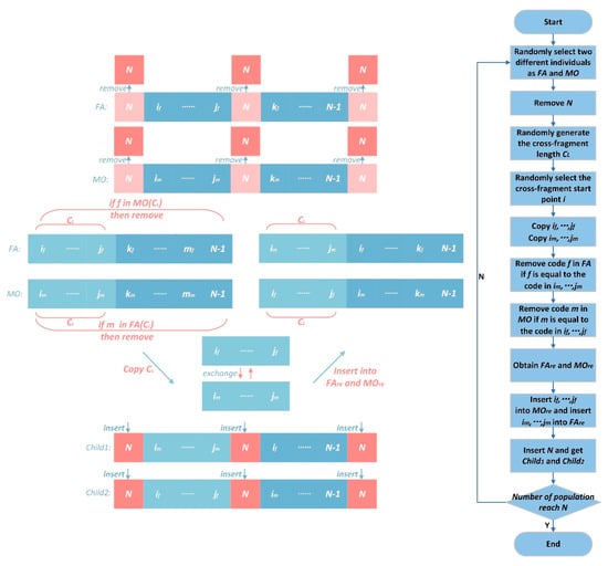 A crossover operator was used to create new chromosomes from the retained individuals in the selection operator. This operator ensured the diversity of the population. As shown in Figure 7, the detailed process of using the crossover operator was as follows: