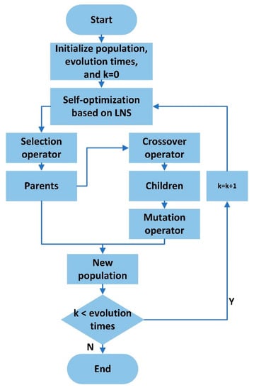 After selecting the water landing site, the population and the parameters of the population were initialized randomly. Then, within the evolution times, the population evolved by using the self-optimization based on LNS, selection operator, crossover operator, and mutation operator. The flowchart of the GA* is show in Figure 9.