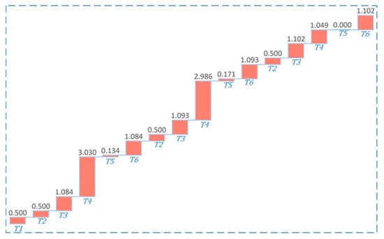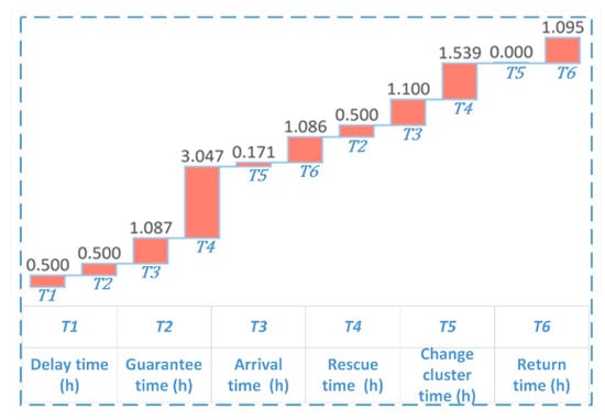 To the best of our knowledge, the distress information sent by the PDT cannot be immediately available to the rescue base in practical applications. Apart from that, the response and the preparation of the TPM will also take some time. Therefore, the start of the rescue may be delayed for some time while the PDTs are in distress. The TPM-X is used to indicate that the start of the rescue is delayed by X hours. Taking the TPM-0.5 as an example, the main screenshots of the TPM-0.5 and the simulation results for 45 PDTs are shown in Figure 12 and Table 2. To illustrate the TPM-0.5 of SRP in detail, the rescue time of each stage is shown in Figure 13.