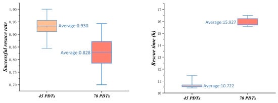 To verify the adaptability of the TPM for different rescue situations, a simulation experiment with 70 PDTs was conducted with other parameters equal to those mentioned in this study. Moreover, the initial positions of the PDTs were randomly generated, which caused uncertainties. The prediction trajectories of the PDTs also caused uncertainties in the Monte Carlo experiments, and the simulation results might be different for the same case because of uncertainty factors, including the hardware platform that supports the simulation environment. Therefore, to reduce the impact of random factors on the simulation results, the simulation of the TPM-0.5 for 45 and 70 PDTs was conducted fifty times separately. The box line diagram of the successful rescue rate and the rescue time for the TPM-0.5 is shown in Figure 14. The results demonstrate the adaptivity of TPM with different numbers s of PDTs. The successful rescue rate decreases as the number of the PDTs increases, whereas the change in the rescue time follows the opposite trend.