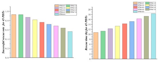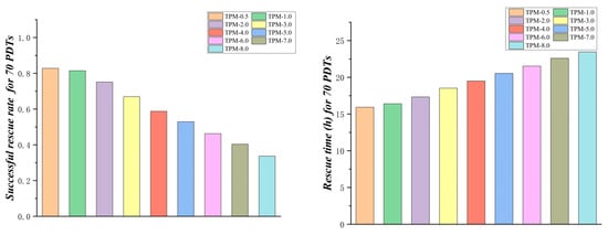 To investigate the effect of the time factor on the effectiveness of the TPM, TPM-X with a delay time varying from 1 h to 8 h was simulated for 45 and 70 PDTs, additionally. To reduce the impact of random factors on the simulation results, the simulation of each TPM-X was conducted fifty times. The simulation results of the successful rescue rate and the rescue time for 45 PDTs are shown in Figure 17. The successful rescue rate and the rescue time for 70 PDTs are shown in Figure 18.