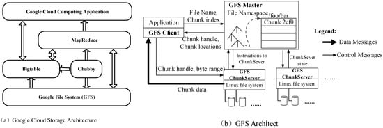 Cloud storage services adopt a master/slave structure, which is the central storage architecture. For example, the infrastructure of Google is mainly composed of four parts: the Google File System [10], the parallel data processing model Map/Reduce [11], the structured data table BigTable [12], and the distributed lock Chubby, as shown in Figure 1a.
