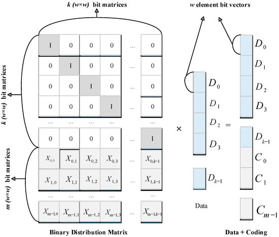 Bit matrix coding was first introduced in the paper on Cauchy Reed–Solomon coding as a parity check array coding technique [29]. CRS encoding is performed using the Cauchy distribution matrix to encode, and decoding is performed when the encoding fails [30]. Suppose in a finite field GF () [31,32], we expand the distribution matrix with w in both rows and columns to obtain a matrix with rows and columns, which we call the BDM (binary distribution matrix). The bottom m × (w × w) matrix is called the CDM (coded distribution matrix). Matrix-based coding is essentially a dot-product operation of matrices and vectors, and different coding methods will result in different coding matrices [33]. The distribution matrix and the vector containing the data blocks are multiplied together to obtain a vector containing the data blocks and the check blocks. When encoding, the check block is obtained by the dot-product operation of the encoding matrix and the data vector. For decoding, we only need to find the rows in the distribution matrix corresponding to the data blocks that are not damaged and form a decoding matrix from these rows. By transposing this matrix and multiplying it with the vector composed of the data blocks that are not damaged, we can calculate the damaged data blocks. We expand the vector to obtain a vector containing elements. Multiplying the matrix and the vector yields a vector containing elements. This is shown in Figure 2. We can see that the bit distribution matrix is composed of many submatrices.