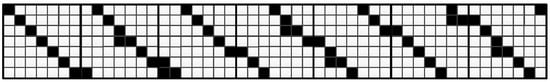 Figure 3 shows the encoded parity matrix in Liberation code when k is 7 and is 7. The black box represents one, while the white box stands for zero. It has been proved that the Liberation code is one of the MDS codes when . The coding matrices for EVENODD, RDP, and Cauchy Reed–Solomon are shown in Figure 8a–c in the Plank article [25].