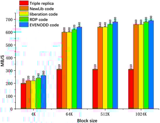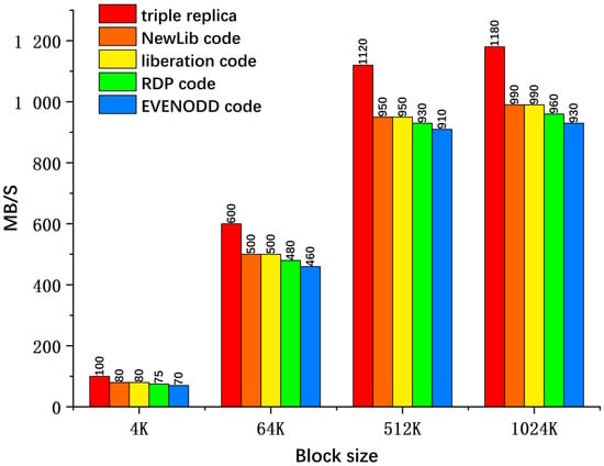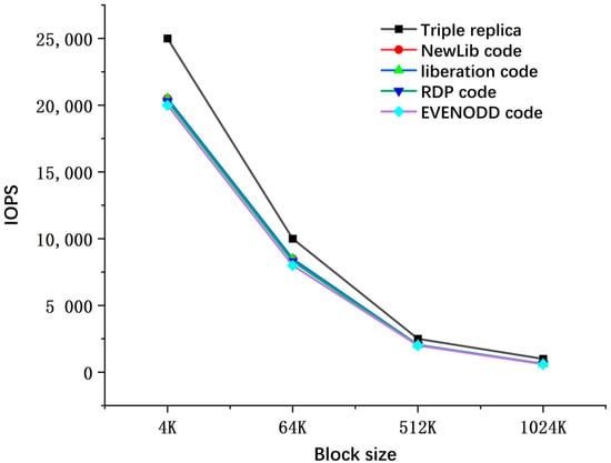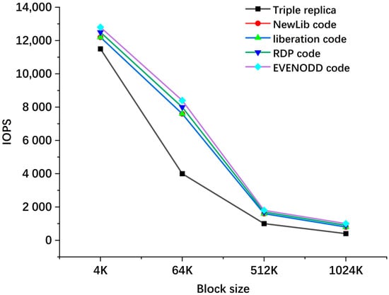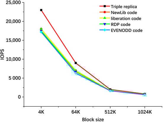 The result of the IOPS in sequential reading is shown in Figure 9. The value of the IOPS decreased as the size of the data block increased, since the IOPS of the system was inversely proportional to the time reading each block, which increased as the block size increased. When the block was 4 K, the value in the NewLib code was about 25% lower than that in the triple replica.
