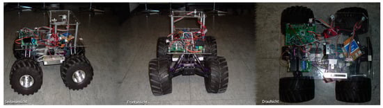 As already mentioned, for this paper, a chassis of a vehicle model type hobby products international (HPI) Savage 2.1 was developed []. As shown in Figure 1, a two-track vehicle was equipped with Ackermann steering. It means that the vehicle can drive with only the two front wheels. In addition, the vehicle has four-wheel drive. The force can be transmitted to all four wheels in the same direction. Thus, similar conditions prevail here as in a conventional automobile with four-wheel drive. Turning on the spot is not possible. It follows that the position and orientation of the vehicle are coupled.