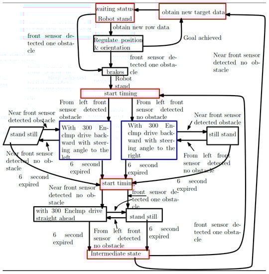 The above-described state machine for avoiding obstacles is shown in Figure 2. If the front sensors detect an obstacle too close, the trajectory run can no longer be continued. Therefore, the robot first stops as fast as the speed controller allows. Then the robot slowly drives backwards for 6 s with the steering turned to the maximum. The steering direction depends on which sensor detected the obstacle. In case the left front sensor detects the obstacle, the wheels are turned to the left; otherwise, the wheels are turned to the right. If one of the rear sensors detects an obstacle, the robot remains standing until the obstacle disappears. For a fixed obstacle, the robot will no longer drive backwards. If an obstacle rushes by, reverse travel is continued after the obstacle has disappeared. It must be remembered that the robot only forgets nearby obstacles after a second. After the time has elapsed, the robot slowly drives straight ahead unless a nearby obstacle is detected by at least one of the front sensors. Otherwise, the robot remains standing, just like when reversing. After 6 s, it is checked whether at least one of the front sensors detects a nearby obstacle. If so, the evasive maneuver described begins again from the beginning. Otherwise, the robot stops and reports to the mini-computer that it has successfully avoided an obstacle. It must then supply new target data, regulation of position and orientation, obstacle detection and avoidance.