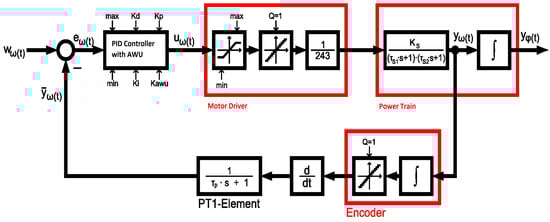 The block diagram of the speed control loop is shown in Figure 3, in which we highlight three red boxes. These boxes are replicas of the real technical control of the robot modules. The red box motor driver describes the MD03 motor driver module. The module expects a manipulated variable with values between −243 and 243. The quantizer then quantizes these to integer values. Finally, the output signal is normalized to values between −1 and 1. It is not normalized to the output voltage of the motor driver since it depends on the battery voltage. The battery voltage is considered in the gain of the controlled . The motor driver directly closes the red box on the drive train, whose input variable is the output of the motor driver.