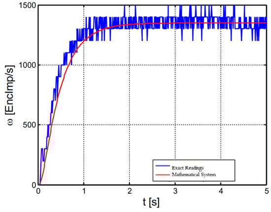 To adjust the control loop, a model of the drive train that is as precise as possible is first required. As already mentioned, the drive is modeled by a PT2 element and subsequent integrator. The parameters are determined by analyzing the robot’s step response. The distance covered is recorded by the robot via the step response function. This recording can then be transferred to a personal computer (PC) for evaluation. However, since the speed step response is sought, the values obtained must be differentiated numerically once. The step response shown in Figure 4 was carried out with two “TruckPuller3 12V” drive motors with a battery voltage of 7.2 V and without a mounted PC. The blue characteristic shows the measured values. The quantization by the rotary encoder can be seen very well with them. The characteristic red curve describes an ideal PT2 element with a gain of = 1350, and the time constants = 0.1 s and = 0.4 s. This element represents a fairly good approximation of the real system.