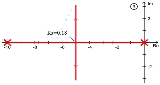 The root locus for this is shown in Figure 5. The aperiodic limiting case occurs at a controller gain of = 0.18. With larger gains, the controller oscillates. The root locus curves were determined using MATLAB’s single-input, single-output (SISO) design tool. If the smoothing in the feedback of the control loop is also considered, the controller receives an additional pole. This also significantly changes the root locus curve. For the controller parameterization, the smoothing has a time constant of = 0.05 s, corresponding to a pole at −20.