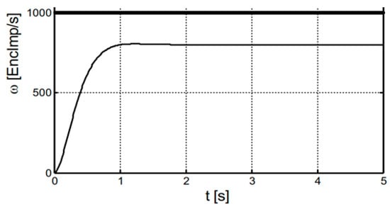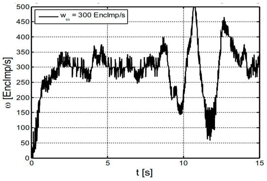 On the other hand, the system also oscillated due to the rotary encoder’s quantization and the controller’s setting. It was parameterized intentionally, so it tends to oscillate, but the amplitude remained below the encoder resolution. A step response followed with a speed of 300 EncImp/s. This was carried out in the courtyard of the EE building of the University of King Abdulaziz. The ground there has bumps at periodic intervals, representing a strong disturbance for the slow drive speed. The bumps are small valleys on the ground surface. The recording is shown in Figure 10 and contains measured values smoothed with a PT1 element with a time constant of 20 ms.