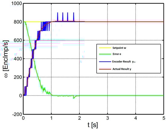 The permanent oscillation is so small that it can no longer be seen in the diagram. The system reached the end value after approximately one second. The controller is thus set almost ideally. Finally, the manipulated variable-limited and quantized control loop was modeled with Simulink and given the same step response. The result can be seen in Figure 8. It can be seen that the actual y value has reached the setpoint u after approx. one second. Furthermore, as expected, a slight overshoot of the actual value and a strong quantization of the speed by the rotary encoder can be seen. Overall, however, this is a very satisfactory result.
