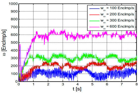 The first experiment analyzed the speed controller. The quantization of the actual speed created by the rotary encoder was 100 EncImp/s. Step responses of the velocity loop from a standing start were recorded for velocities of 100, 200, 300 and 600 EncImp/s. Based on the simulations already carried out on the ideal robot model, the final value should be reached after about one second. The step responses were recorded in the hallway of the electrical engineering (EE) building at the University of King Abdulaziz. Since the ground there is very flat, it is an almost interference-free environment. Figure 9 shows the four-step responses in a jitter-free time diagram, where the graphs were previously smoothed with a digital PT1 element with a time constant of 20 ms.