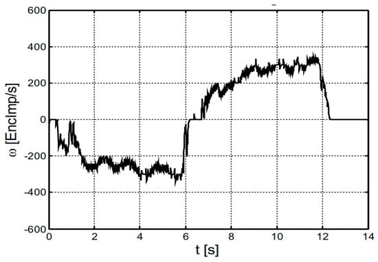 Now, the course of the speed when driving around an obstacle is shown for completeness. The robot should move backwards for 6 s with 300 EncImp/s and then forward at the same speed for 6s. The course of the actual speed, which was smoothed with a PT1 element with a time constant of 20 ms, is shown in Figure 11.