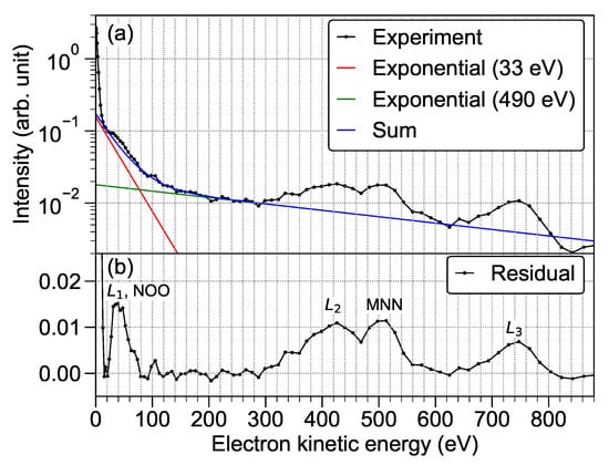 A number of photo- and Auger electrons, which are decelerated via collisional ionization processes, have been observed as the peaks. Figure 1b depicts a residual spectrum between the experimental electron spectrum and the sum of two exponential decay curves (see a blue curve in Figure 1a). In the previous electron spectroscopy study of xenon clusters with an average size of 10,000 atoms, the contributions of decelerated photo- and Auger electrons were also reported as evidence of the formation of nanoplasma by XFEL irradiation [55]. and photo-emissions, whose kinetic energies are originally ∼400 and ∼720 eV, respectively, in atomic case, have been observed as peaks, with a tail toward the low-energy side; this indicates that their kinetic energies are lost via the collisional ionization processes. The peak around 500 eV corresponding to MNN Auger electrons [56] also shows a tail due to the deceleration caused by the collisional ionization processes.
