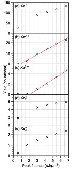 Ion yields as a function of XFEL peak fluence: (a) Xe, (b) Xe, (c) Xe, (d) Xe, and (e) Xe. Red broken lines are shown as guides for the eye in (b,c).