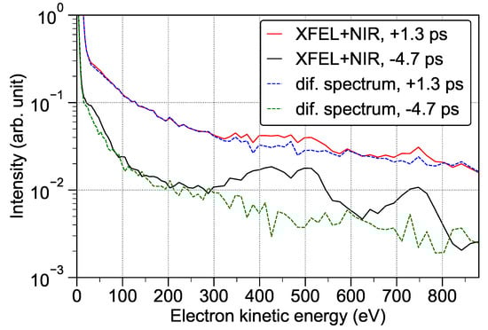 Let us now focus on the results of XFEL pump–NIR probe experiments in order to investigate intermediate states of the expanding nanoplasma. Figure 5 shows the time-resolved electron energy spectra for xenon clusters with an average size of 5000 atoms, where the peak fluence of XFEL is ∼1.8 J/m and the intensity of NIR laser is 5.0 × 10 W/cm. The red and black curves illustrate the electron energy spectra irradiated by an XFEL pump–pulse and a NIR probe–pulse with the time delays of +1.3 and −4.7 ps, respectively. The meaning of positive time delays is that the NIR probe–pulses arrive at the reaction point later than the XFEL pump pulses. At the present NIR laser intensity (5.0 × 10 W/cm), the Keldysh parameter is calculated to be 4.5, meaning that the multiphoton ionization is expected to be dominant for individual xenon atoms. The present NIR laser intensity is too low to ionize xenon atoms via the multiphoton process; however, one can clearly observe that the additional irradiation with the weak probe laser at time delay of +1.3 ps causes a significant increase in the electron emission from the XFEL-ignited nanoplasma compared to the electron kinetic energy spectrum at −4.7 ps time delay. By subtracting the contribution of photo- and Auger electrons (depicted by the black curve in Figure 1b), the difference spectra have been obtained (see the blue and green curves in Figure 5). These difference spectra indicate that the NIR probe pulses with the positive time delays have mainly enhanced the unstructured contributions of electron spectra.