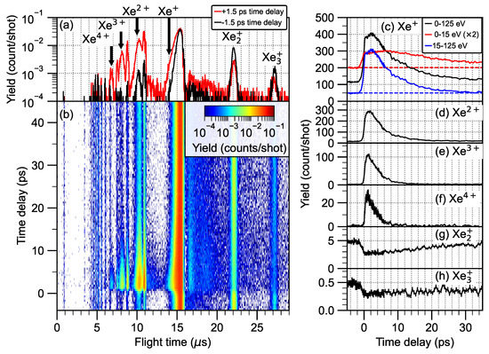 In order to discuss the time-delay dependence in more detail, we show the ion yields as a function of time delay in the black curves in Figure 6c–h. The yields of Xe, Xe, and Xe increased sharply from ∼0 ps, reached peaks around 2 ps, and gradually decreased until ∼15 ps. A similar time-delay dependence has been observed in the time-resolved ion spectroscopy by using the XUV pump–NIR probe method, which has been attributed to the surface plasma resonance effect [35].
