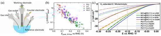 (a) Schematic of the electrolyzer for the rotating disk electrode (RDE) [14]; (b) Correlation between the exchange current density of the HOR/HER and Hupd desorption peak potential [15]; (c) The polarization curves of Pt (111) and NiFe@Pt (111) electrocatalysts (Ni:Fe ratio of 1:1) were recorded in different alkaline solutions recorded at a rotation rate of 1600 rpm and a scan rate of 50 mV s−1 [43]. Copyright 2019, 2020 John Wiley and Sons.