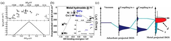 The “volcano plot”, first established by Parsons, connects the value of j0 with ΔGH* calculated using the Density Functional Theory (DFT) to describe the adsorption strength of H* on the catalyst surface [53]. Later, based on experiments, researchers established the “volcano plot” (Figure 4a) using the correlation between j0 values of some elements and ΔGH* calculated using the DFT [8]. ΔGH* < 0 indicates that the adsorption of H* is too strong and the desorption of H2 is not sufficient, which causes the active centers on the catalyst to be blocked, thus resulting in catalyst poisoning and hindering the reaction from proceeding [54,55]. ΔGH* > 0 means the adsorption of H* is too weak. The hydrogen atoms are not easily absorbed on the metal surface, and the coverage of hydrogen on the material surface is reduced, which causes the active center to not be effectively utilized, further slowing down the reaction speed [56]. Therefore, the energy of the intermediate is neither too strong nor too weak on the surface for an ideal catalyst. It can be seen from the figure that the platinum group precious metals located at the vertex of the volcanic curve have the best HER activity.