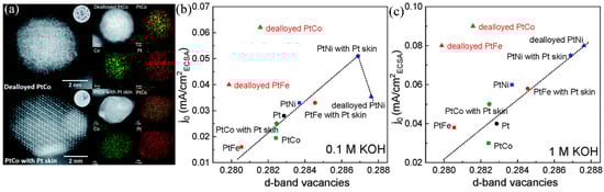 (a) HAADF-STEM and EDS mapping images of a dealloyed PtCo sample and PtCo with Pt skin. (b,c) The experimentally acquired relationship between the d–band vacancies and j0 for a series of Pt–based materials in (b) 0.1 M KOH and (c) 1 M KOH solutions [68]. Copyright 2019 Royal Society of Chemistry.