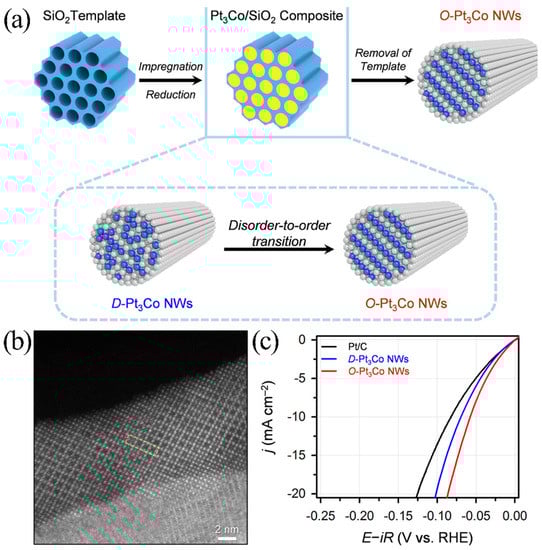 The synthesis of intermetallic compounds can be divided into two types: annealing after liquid phase synthesis and direct liquid phase synthesis. The difference between the above two methods is the annealing step and the formation mechanism of the ordered structure. The annealing after liquid phase synthesis needs high-temperature treatment under a reduced gas atmosphere. When the annealing temperature is higher than 500 °C, the size and shape of nanostructures are unevenly distributed during the transition from disorder to order, which makes it difficult to accurately control the size and shape of the nanostructures of intermetallic compounds [80]. The direct liquid phase synthesis needs a seed to grow material. During this process, it is hard to control the size of the catalyst. Therefore, developing a synthetic strategy that can accurately control the size and shape of intermetallic compounds is a challenge. Kim et al. [81] used a mesoporous silica template to synthesize a well-defined nanomaterial through nanomaterial space limiting. This method allows precise control of the size and shape of nanostructures by converting disordered alloy Pt3Co nanowires (D-Pt3Co-NWs) into ordered intermetallic compound Pt3Co nanowires (O-Pt3Co-NWs) without agglomeration (Figure 6a,b). O-Pt3Co NWs have higher HER activity than O-Pt3Co NWs and Pt/C catalysts in alkaline conditions (Figure 6c). The enhancement of the O-Pt3Co NWs HER kinetic is achieved through alloying and atomic ordering regulation of the hydrogen binding energy.