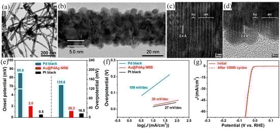 (a,b) TEM images and (c,d) HRTEM images of 4H/fcc Au@PdAg core–shell nanoribbons. (e) Onset potentials and overpotentials (at j = 10 mA cm−2) of Pd black, 4H/fcc Au@PdAg NRB, and Pt black. (f) Corresponding Tafel plots. (g) Durability test of 4H/fcc Au@PdAg NRB. All measurements were conducted in a 0.5 M H2SO4 aqueous solution [83]. Copyright 2016 American Chemical Society.