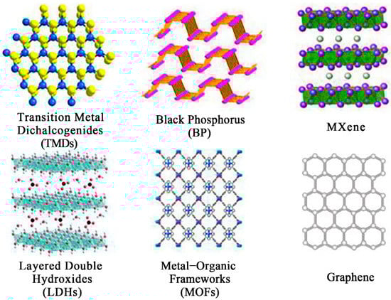 The ultrathin 2D nanomaterials have attracted broad attention since Novoselov et al. [100] mechanically separated graphene from graphite in 2004. In recent years, researchers have developed many ultrathin 2D materials (Figure 8), such as transition metal dichalcogenides, metal-organic frameworks, hexagonal boron nitride, graphite carbon nitride, black phosphorus, MXenes, layered metal oxides and layered double hydroxides [101].