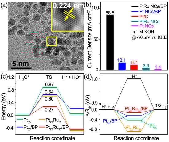 - Li, Y.; Pei, W.; He, J.; Liu, K.; Qi, W.; Gao, X.; Zhou, S.; Xie, H.; Yin, K.; Gao, Y. Hybrids of PtRu nanoclusters and black phosphorus nanosheets for highly efficient alkaline hydrogen evolution reaction. ACS Catal. 2019, 9, 10870–10875. [Google Scholar] [CrossRef]