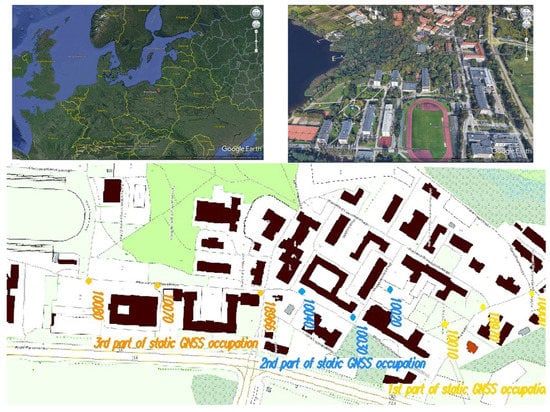 In the next study, analyses of the coordinates of the control points that were determined using only RTK/RTN surveys with a Leica GS15 receiver were performed. The real-time technique was realized by using multiple reference stations (VRS or MAC) and single reference station (SRS) corrections. Some points were located in more difficult field conditions, in the so-called “city canyons”, under trees, and near buildings. The Kortowo campus is a wonderful place for the study of activity [34]. In our geo-engineering activities, we carry out many measurement works on the campus. We designate control network points for direct surveys and checkpoints for remote measurement techniques and their location was also the subject of previous publications by poster or paper [35,36].
