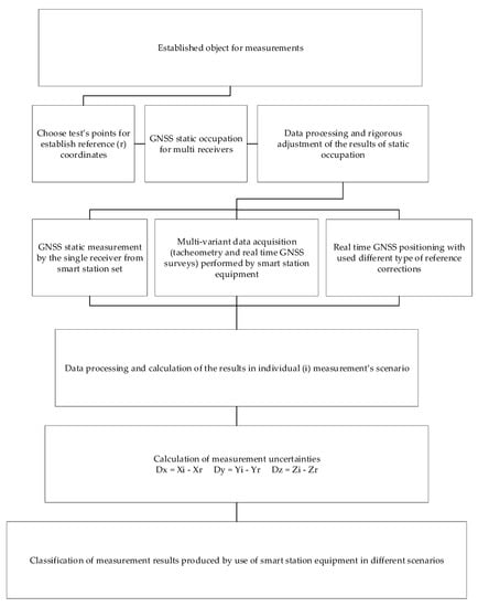 The model data were used for calculating the differences of coordinates after applying reference (r) GNSS static occupation and with the use of an individual (i) measurements scenario (the steps of the proposed approach are presented below in Figure 2).