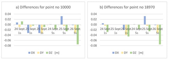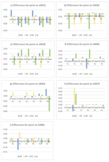 In the considered scenarios of the measurements, the biggest difference for the X coordinate equal to 0.160 m was obtained for point 10030 (30 s GL). However, the smallest difference for the X coordinate equal to 0.000 m was obtained for point 10070 (30 s G&GL). The biggest difference for the Y coordinate equal to 0.170 m was obtained for point 10030 (15 s GL). However, the smallest difference for the Y coordinate equal to 0.000 m was obtained for points: 10000 (5 s G&GL), 18970 (5 s GL, 10 s GL, and 15 s GL), 10020 (15 s G&GL, 15 s G), 18966 (15 s G&GL and 30 s G&GL), and 10070 (15 s G&GL). The biggest difference for the height (for Z coordinate), equal to 0.248 m, was also found for point 10030 (30 s GL). On the other hand, the smallest difference for the Z coordinate equal to 0.000 m was obtained for points: 10020 (30 s G&GL) and 10080 (1 s G&GL).
