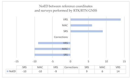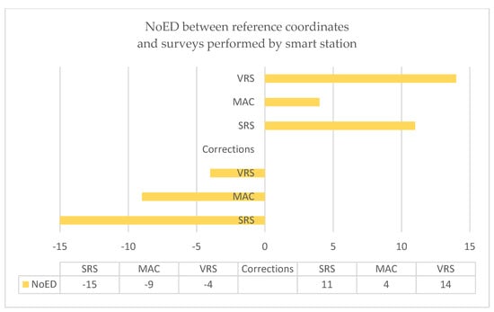 In the case of multi-variant surveys, the differences of coordinates were calculated too. The differences between the reference coordinates from model static GNSS occupation and the surveys performed using smart station equipment were calculated. The number of maximum differences in positioning (for plus or minus) after applying GNSS static occupation and with the use of the individual type of corrections in multi-variant measurements (single reference station SRS, master-auxiliary concept MAC, or virtual reference station VRS). The number of extreme differences (NoED) of coordinates between the reference coordinates from model static GNSS occupation and surveys performed using the smart station are present below in Figure 4.