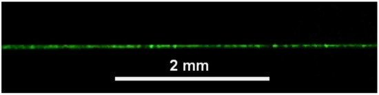 In Figure 1, we exhibit a pattern of the track of a continuous wave (CW) low-intensity laser radiation with a wavelength of λ = 532 nm, scattered at 90 degrees in deionized water. In addition, the liquid samples were filtered by forcing the liquid through a highly hydrophilic polymer track membrane (purchased from Sartorius, Germany), which is made of high-quality polycarbonate. The capillary structure of the pores of these membranes is uniform; the pores are also evenly distributed over the membrane surface, allowing the best retention of particles. The pore size was 300 nm; thus, individual bubstons with a radius of 100 nm pass through the membrane, but bubston clusters larger than a micron in size are filtered out by such a membrane. Note that immediately after filtering, the scattered radiation track is absolutely homogeneous, so we do not present this pattern here. After filtration, the liquid sample was settled for 24 h in a cell in a dust-free room; i.e., an access of solid impurity particles to the sample was excluded. In Figure 1, we present a snapshot of the track after such settling.