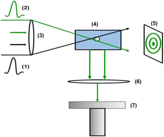 Schematic diagram of the experimental setup for observing the effect of stimulated optical coalescence. (1)—laser pulse at a wavelength λ = 1064 nm; (2)—laser pulse at a wavelength of 532 nm; (3)—lens system; (4)—cell with liquid; (5)—screen for observing the instantaneous diffraction pattern; (6)—lens system; (7) Hamamatsu S1226-5BQ avalanche photodiode.
