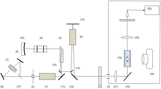 Schematic of the experimental setup. (1)—active element of YAG:Nd3+; (2), (3)—diaphragms (∅ = 2.5 mm); (4) electro-optical modulator (DKDP crystal); (5)—polarizing prism; (6) YAG:Nd3+ amplifier; (7)—passive shutter in the Sagnac interferometer; (8)–(16)—mirrors (reflection coefficient R = 1.0); (17)—semitransparent mirror (reflection coefficient R = 0.5); (18)—cell with test water; (19)—camera; (20)—spectrometer; (21), (22)—focusing lenses; (23)—notch-filter that transmits only radiation at wavelength λ = 1064 nm.
