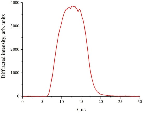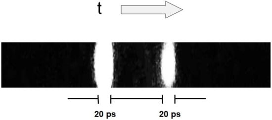 A single laser pulse with a wavelength (λ = 1064 nm) and a duration of 20 ps was separated from a train of ultrashort pulses (the laser setup is described in detail in [42]). Stable generation was achieved due to the temporal coincidence of saturation of the gain of the active medium and transmission of the passive shutter (the so-called “second generation threshold”). The time profile of the laser pulse was controlled by an electro-optical converter with a time resolution of 6 ps (not shown in Figure 4). Figure 5 shows a typical snapshot of a single laser pulse with a duration of τ = 20 ps at a wavelength of λ = 1064 nm, reflected from two surfaces of a beam-splitting glass plate installed at an angle of 45° to the optical axis and diverting part of the laser pulse to the input of a high-speed streak camera.